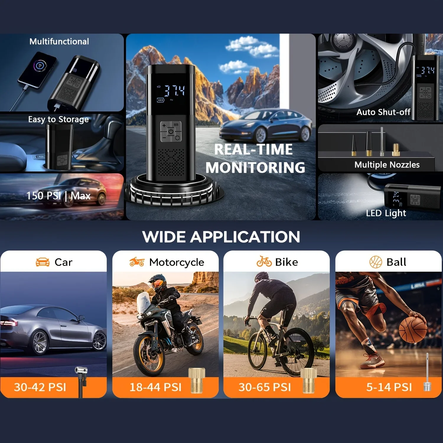 Compresseur d’air portable sans fil rechargeable avec affichage numérique, gonfleur de pneus pour voiture, moto, vélo et ballons